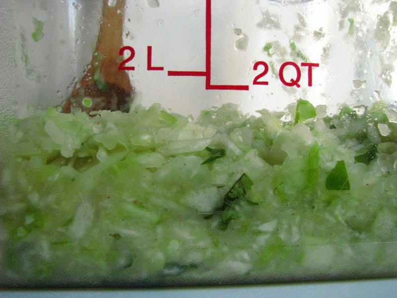 Place vegetables, salt, lemon juice, whey, and spices in a large bowl or bucket and beat with a sturdy wooden spoon for about 10 minutes. The mixture will release quite a lot of liquid (see the pictures below.) Add basil leaves and chop for about a minute to disperse evenly. Taste to adjust spices.